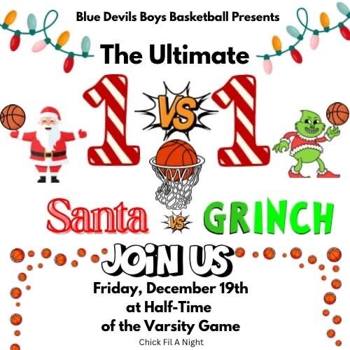 Come support the boys basketball team and cheer them on to victory Friday night against Greenville! At halftime of the varsity game, watch the ultimate game of one vs. one as Santa plays the Grinch...