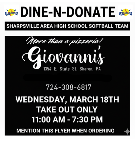 Another reminder to support the Sharpsville softball team today by ordering takeout from Giovanni's in Sharon! Mention the fundraiser when placing your order. From 11:00 AM-7:30 PM today!