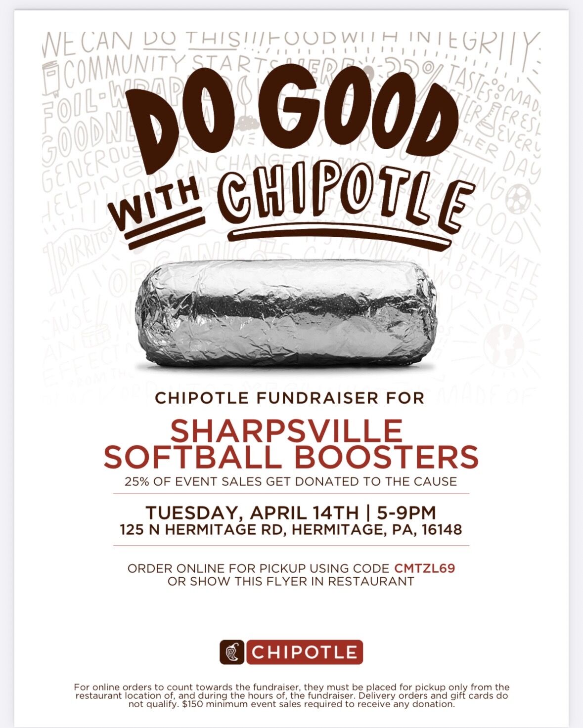 Support the Sharpsville Softball team by grabbing dinner at Chipotle on Tuesday, April 14th! Mention the flyer when placing your order or use the code CMTZL69 when ordering online.