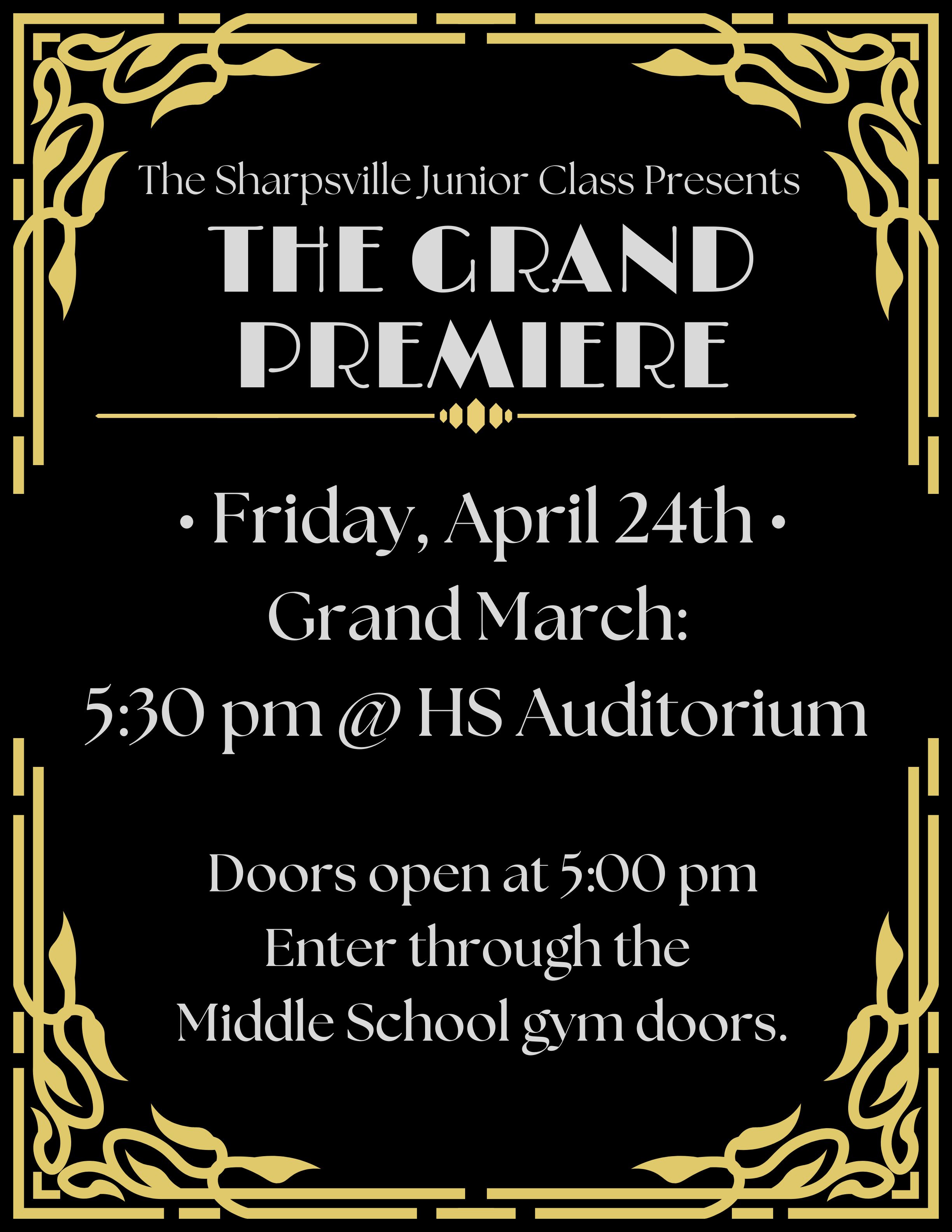 The Sharpsville Junior Class presents: The Grand Premiere. Enjoy Grand March in the Middle/High School Auditorium at 5:30 on Friday April 24th. Doors will open at 5:00 pm. Please enter through the ...
